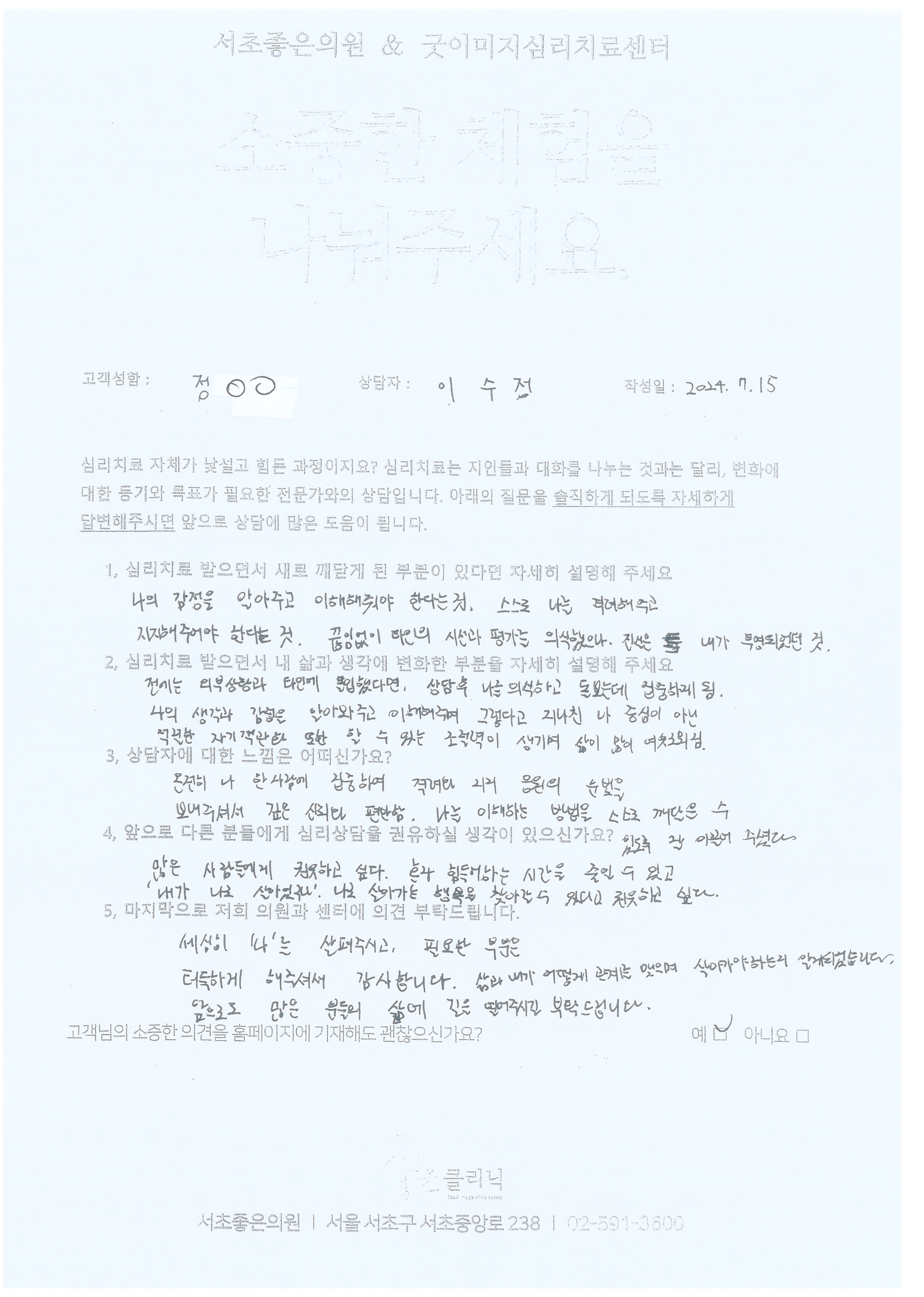 정**님의 심리치료(이수정 심리치료사)후기입니다.